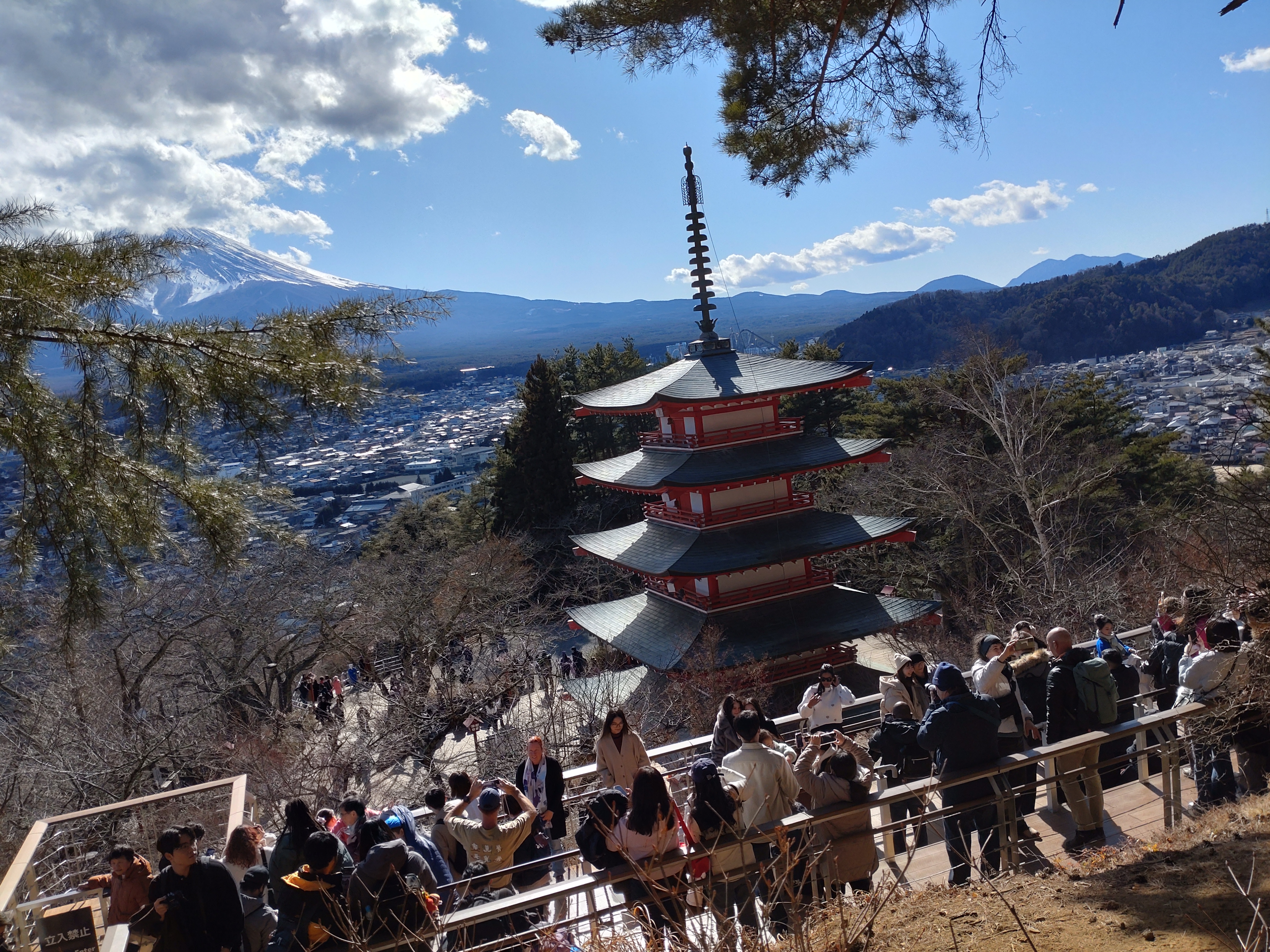 The park begins at the base of Mt. Arakurayama and extends up the mountain. At the top of a 398 stair hike is an observation deck that looks out over the cityscape of Fujiyoshida City and majestic Mt. Fuji towering above. Though the Spring sakura (cherry blossom) season is best for capturing the symbolic image of Mt. Fuji, cherry blossoms and five-storied pagoda,
